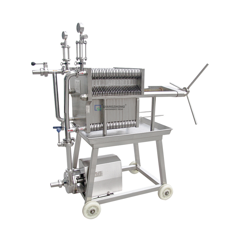 不锈钢板框式精滤机的每块滤板的四角有4个通液角孔,只有一侧竖向的2个角孔与内部相通,滤板与滤框交替排列(两面带孔板的为滤板,无孔板的为滤框)。过滤时,由滤框一侧的2个通液角孔进料,透过过滤层(过滤介质)后,清液由滤板一侧的2个出液角孔排出。